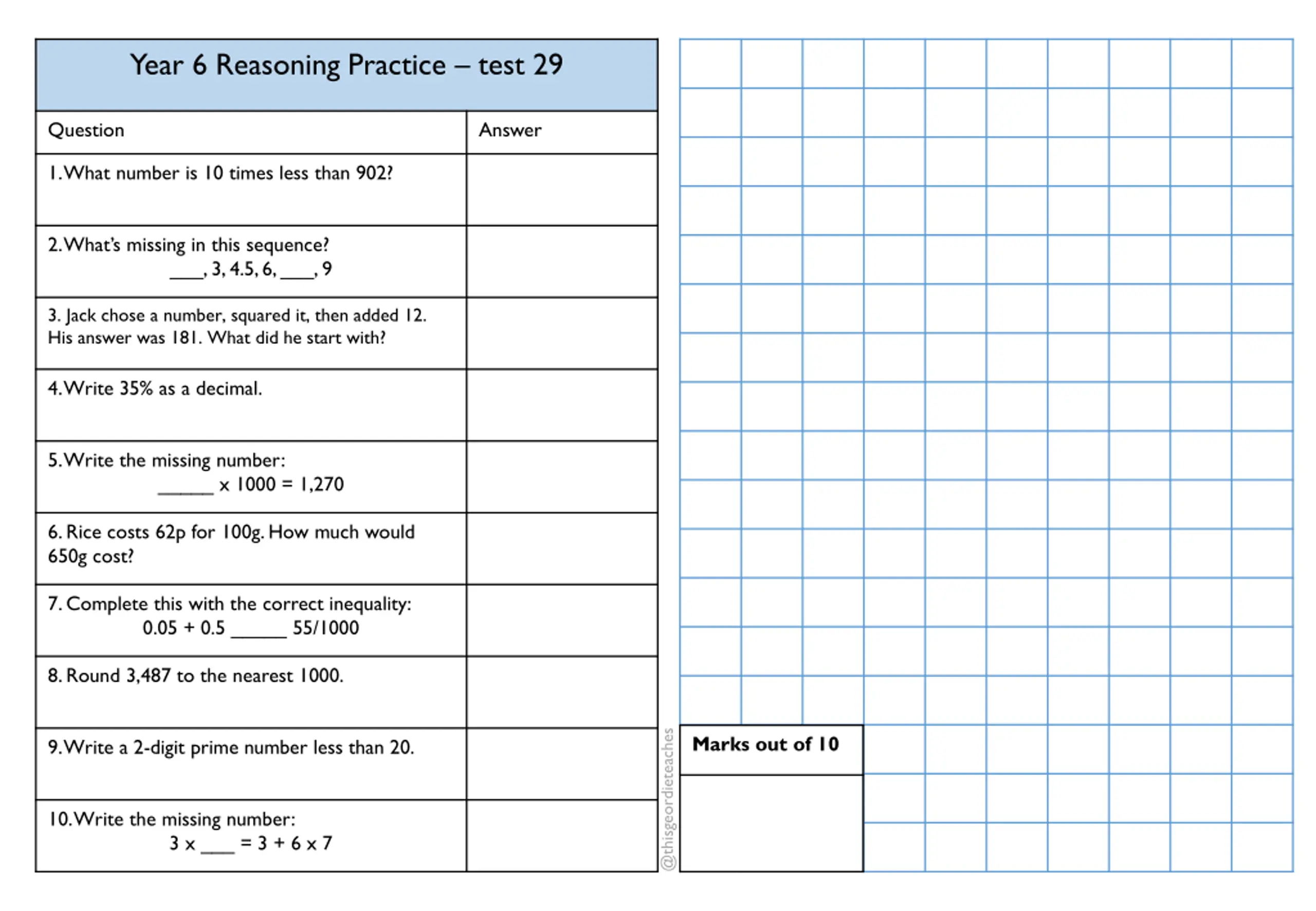 Year 6 Reasoning Practice – test 29 Question Answer 1. What number is 10 times less than 902? 2. What’s missing in this sequence? ___, 3, 4.5, 6, ___, 9 3. Jack chose a number, squared it, then added 12. His answer was 181. What did he start with? 4. Write 35% as a decimal. 5. Write the missing number: _____ x 1000 = 1,270 6. Rice costs 62p for 100g. How much would 650g cost? 7. Complete this with the correct inequality: 0.05 + 0.5 _____ 55/1000 8. Round 3,487 to the nearest 1000. @thisgeordieteaches Marks out of 10 9. Write a 2-digit prime number less than 20. 10. Write the missing number: 3 x ___ = 3 + 6 x 7