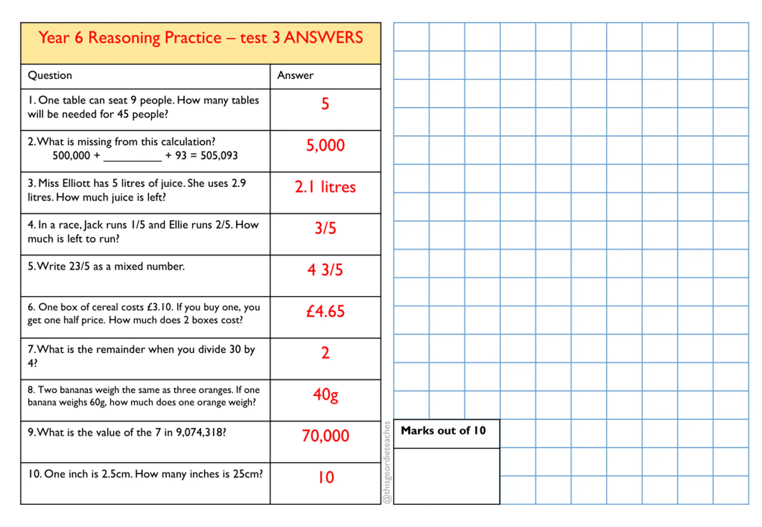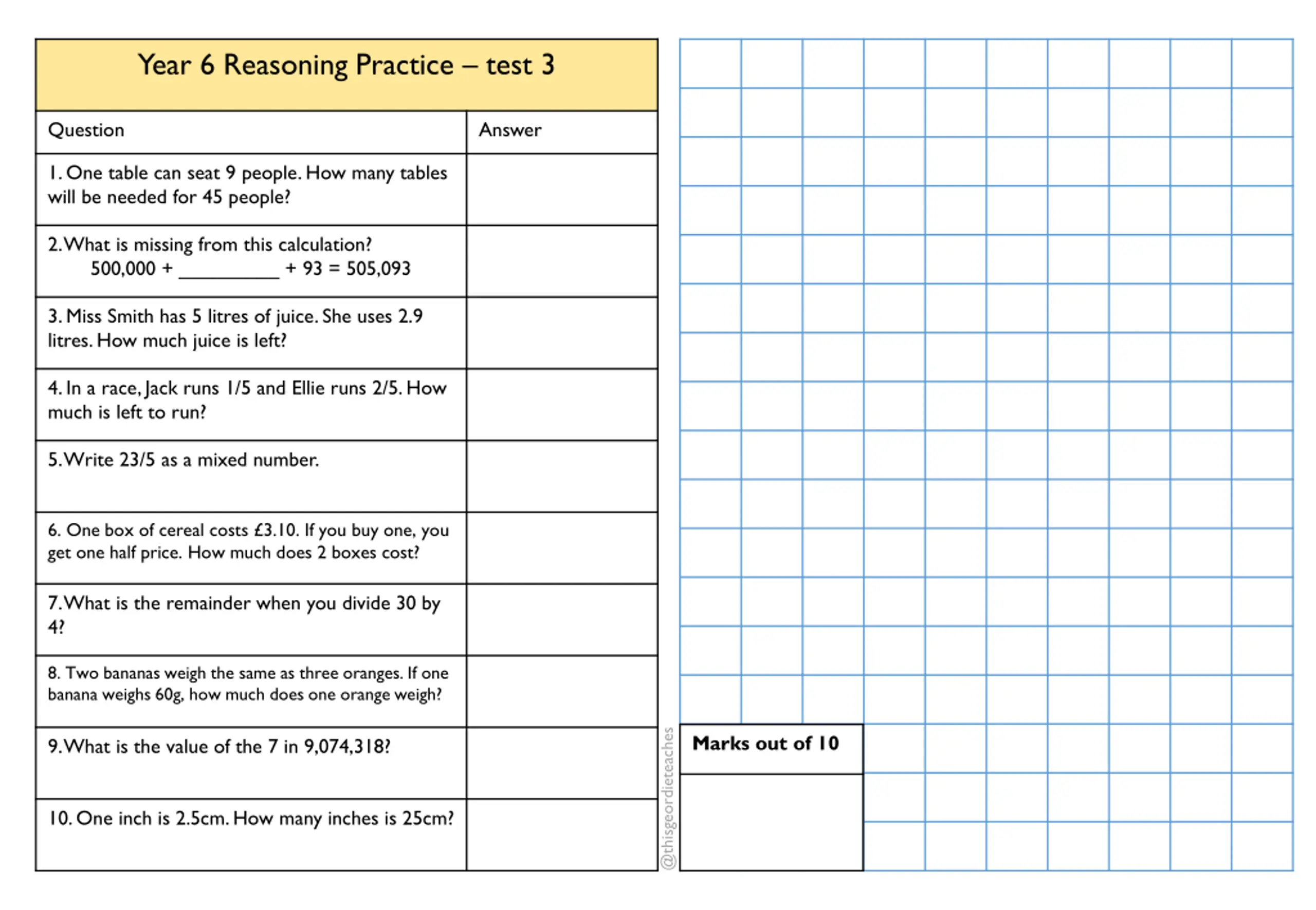 Year 6 Reasoning Practice – test 3 Question Answer 1. One table can seat 9 people. How many tables will be needed for 45 people? 2. What is missing from this calculation? 500,000 + _________ + 93 = 505,093 3. Miss Smith has 5 litres of juice. She uses 2.9 litres. How much juice is left? 4. In a race, Jack runs 1/5 and Ellie runs 2/5. How much is left to run? 5. Write 23/5 as a mixed number. 6. One box of cereal costs £3.10. If you buy one, you get one half price. How much does 2 boxes cost? 7. What is the remainder when you divide 30 by 4? 8. Two bananas weigh the same as three oranges. If one banana weighs 60g, how much does one orange weigh? @thisgeordieteaches Marks out of 10 9. What is the value of the 7 in 9,074,318? 10. One inch is 2.5cm. How many inches is 25cm?