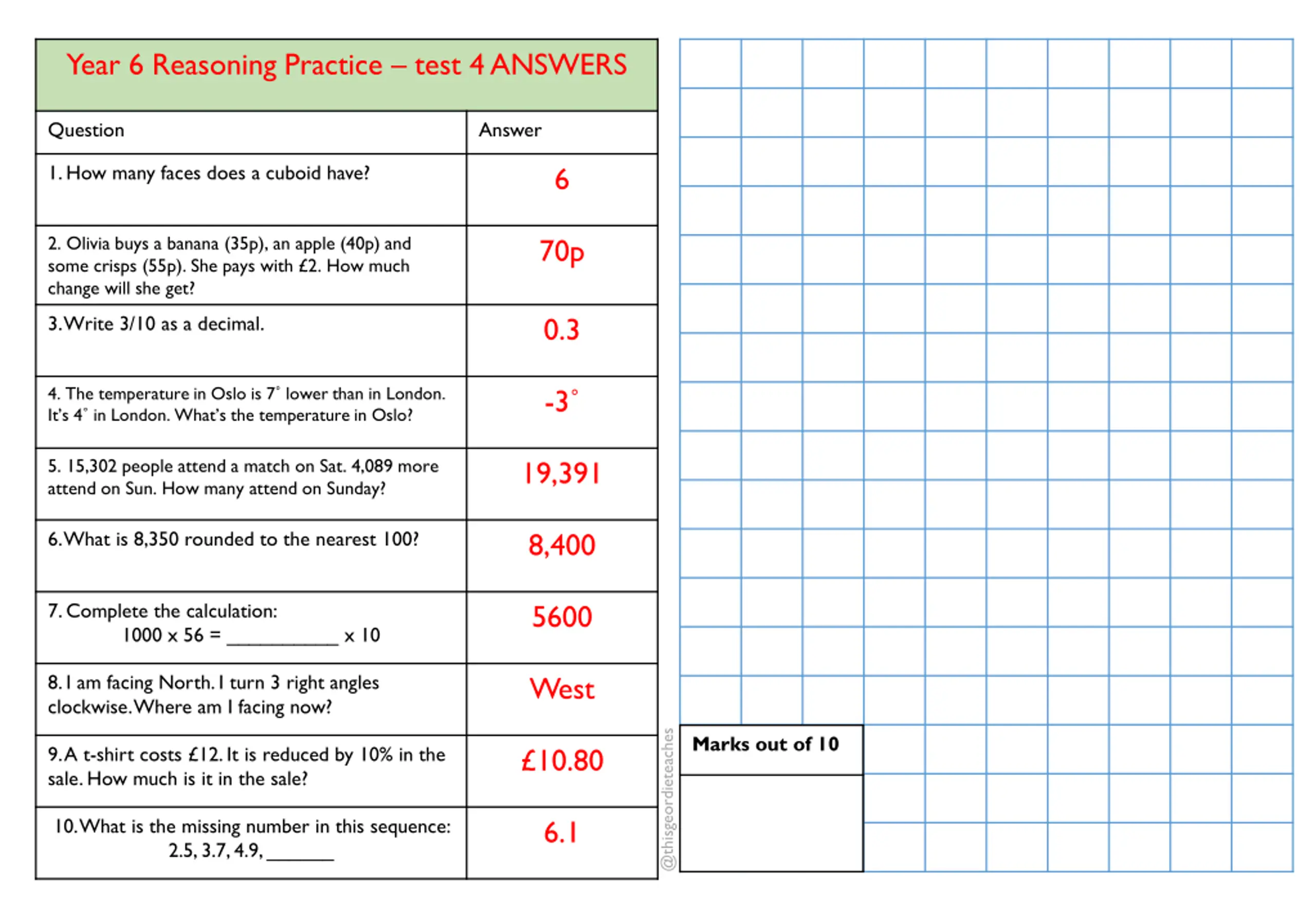 Year 6 Reasoning Practice – test 4 Question Answer 1. How many faces does a cuboid have? 2. Olivia buys a banana (35p), an apple (40p) and some crisps (55p). She pays with £2. How much change will she get? 3. Write 3/10 as a decimal. 4. The temperature in Oslo is 7˚ lower than in London. It’s 4˚ in London. What’s the temperature in Oslo? 5. 15,302 people attend a match on Sat. 4,089 more attend on Sun. How many attend on Sunday? 6. What is 8,350 rounded to the nearest 100? 7. Complete the calculation: 1000 x 56 = __________ x 10 8. I am facing North. I turn 3 right angles clockwise. Where am I facing now? @thisgeordieteaches Marks out of 10 9. A t-shirt costs £12. It is reduced by 10% in the sale. How much is it in the sale? 10. What is the missing number in this sequence: 2.5, 3.7, 4.9, ______