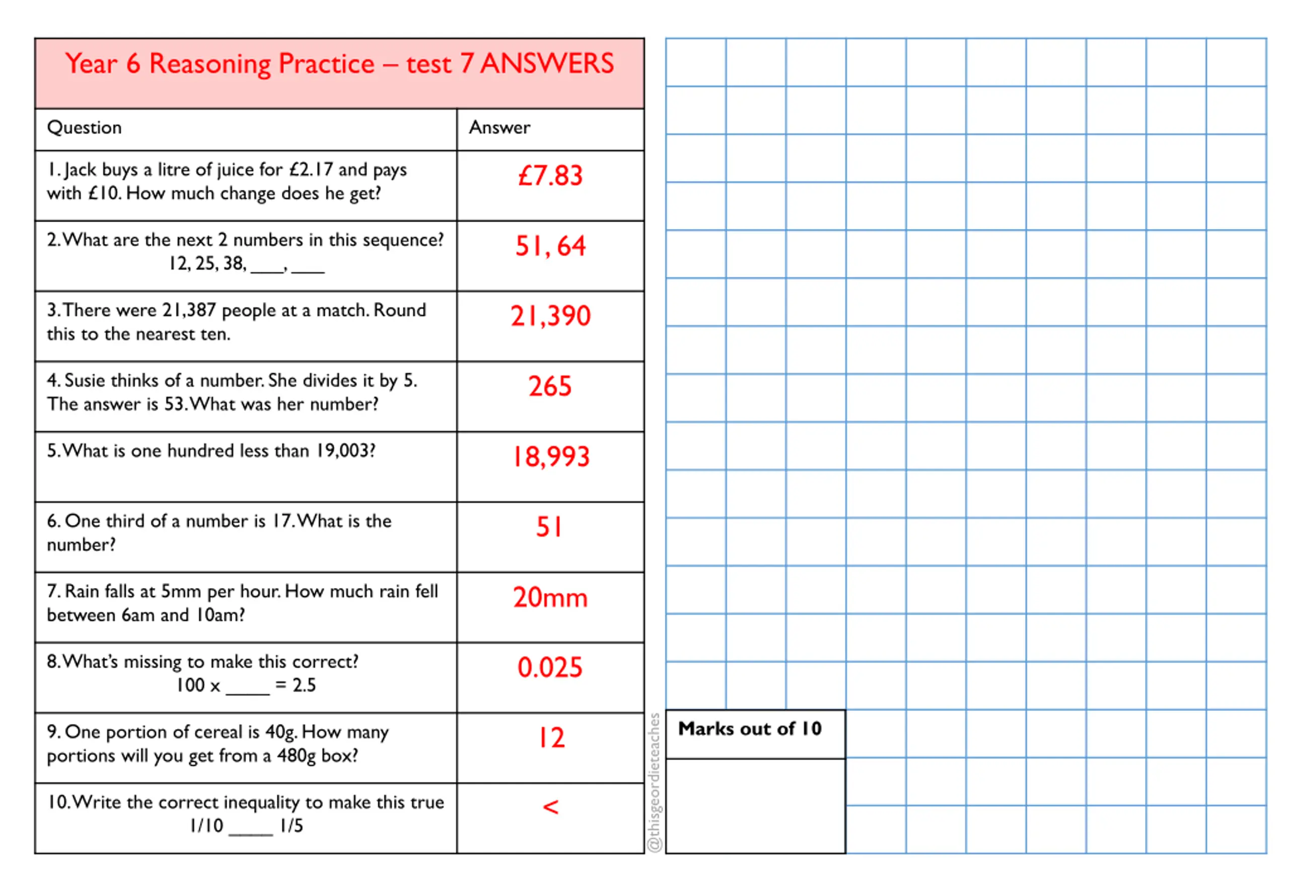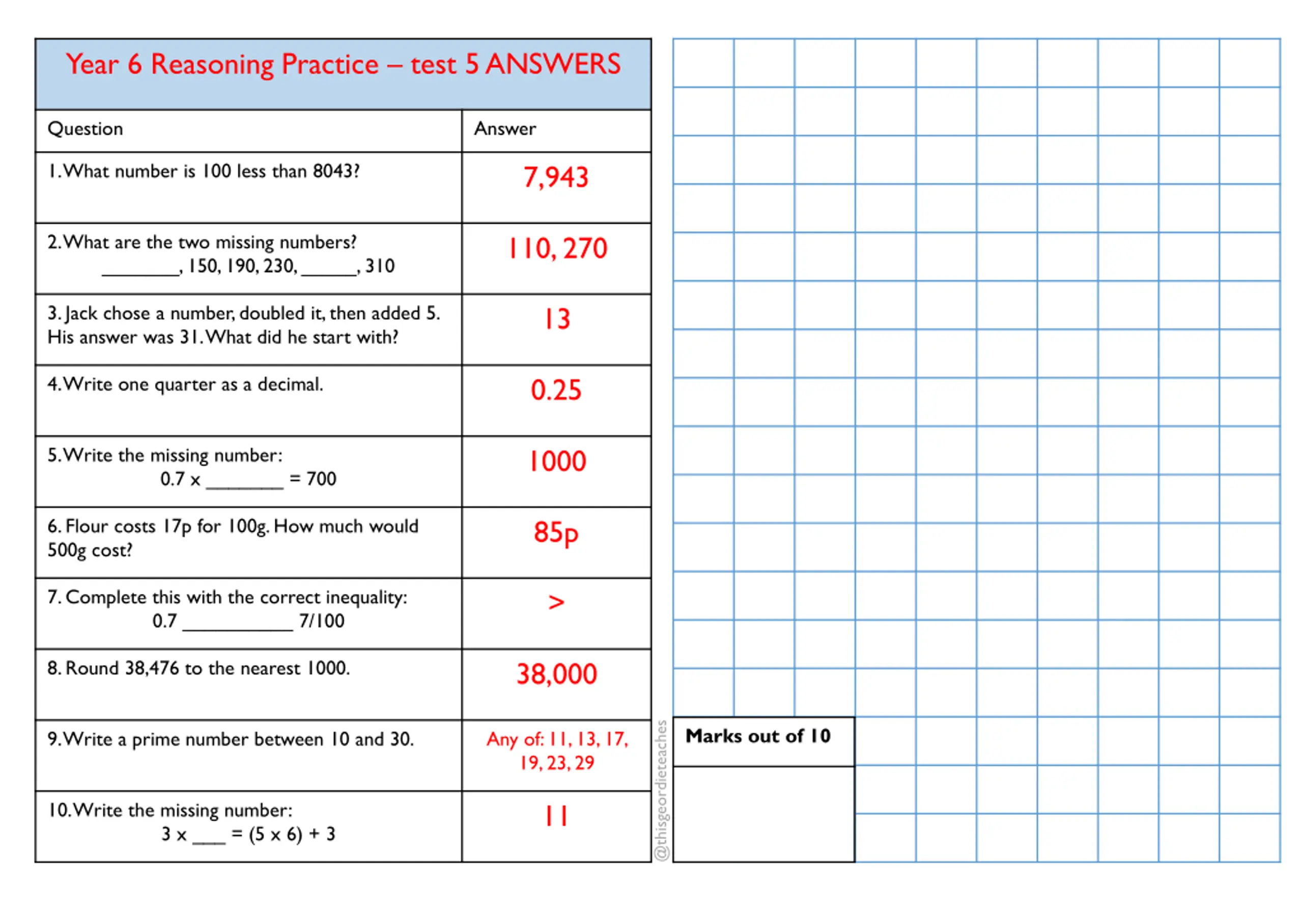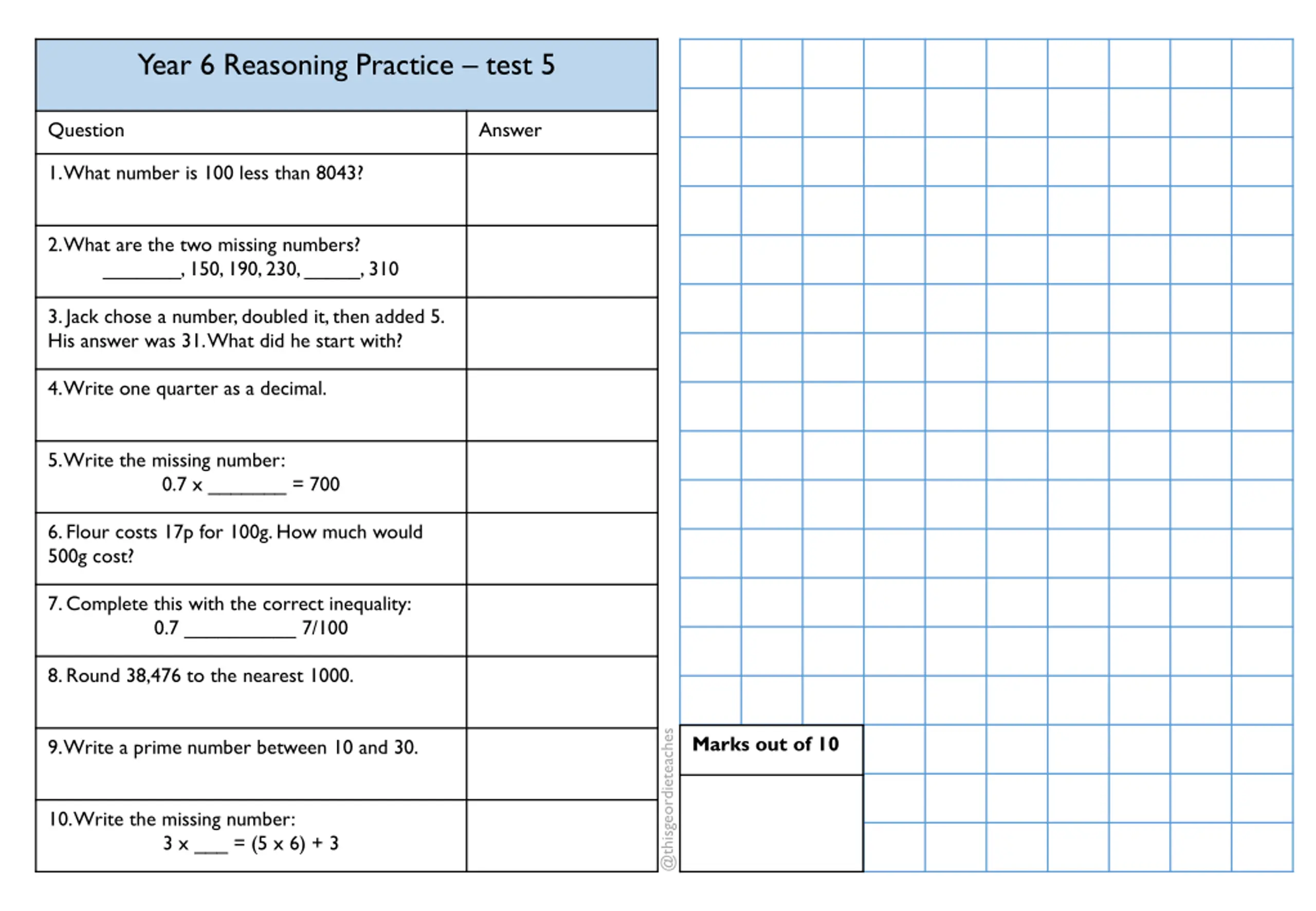 Year 6 Reasoning Practice – test 5 Question Answer 1. What number is 100 less than 8043? 2. What are the two missing numbers? _______, 150, 190, 230, _____, 310 3. Jack chose a number, doubled it, then added 5. His answer was 31. What did he start with? 4. Write one quarter as a decimal. 5. Write the missing number: 0.7 x _______ = 700 6. Flour costs 17p for 100g. How much would 500g cost? 7. Complete this with the correct inequality: 0.7 __________ 7/100 8. Round 38,476 to the nearest 1000. @thisgeordieteaches Marks out of 10 9. Write a prime number between 10 and 30. 10. Write the missing number: 3 x ___ = (5 x 6) + 3
