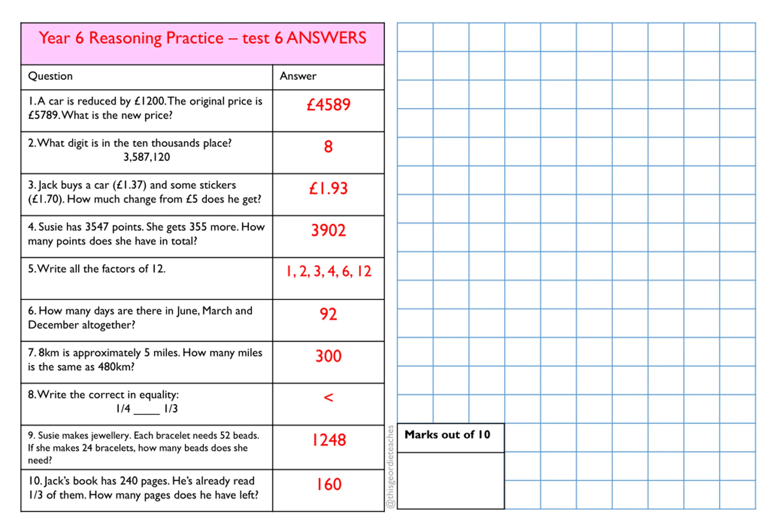 Year 6 Reasoning Practice – test 6 ANSWERS Question Answer 1. A car is reduced by £1200. The original price is £5789. What is the new price? £4589 2. What digit is in the ten thousands place? 3,587,120 8 3. Jack buys a car (£1.37) and some stickers (£1.70). How much change from £5 does he get? £1.93 4. Susie has 3547 points. She gets 355 more. How many points does she have in total? 3902 5. Write all the factors of 12. 1, 2, 3, 4, 6, 12 6. How many days are there in June, March and December altogether? 92 7. 8km is approximately 5 miles. How many miles is the same as 480km? 300 8. Write the correct in equality: < 1/4 ____ 1/3 @thisgeordieteaches Marks out of 10 9. Susie makes jewellery. Each bracelet needs 52 beads. If she makes 24 bracelets, how many beads does she need? 1248 10. Jack’s book has 240 pages. He’s already read 1/3 of them. How many pages does he have left? 160