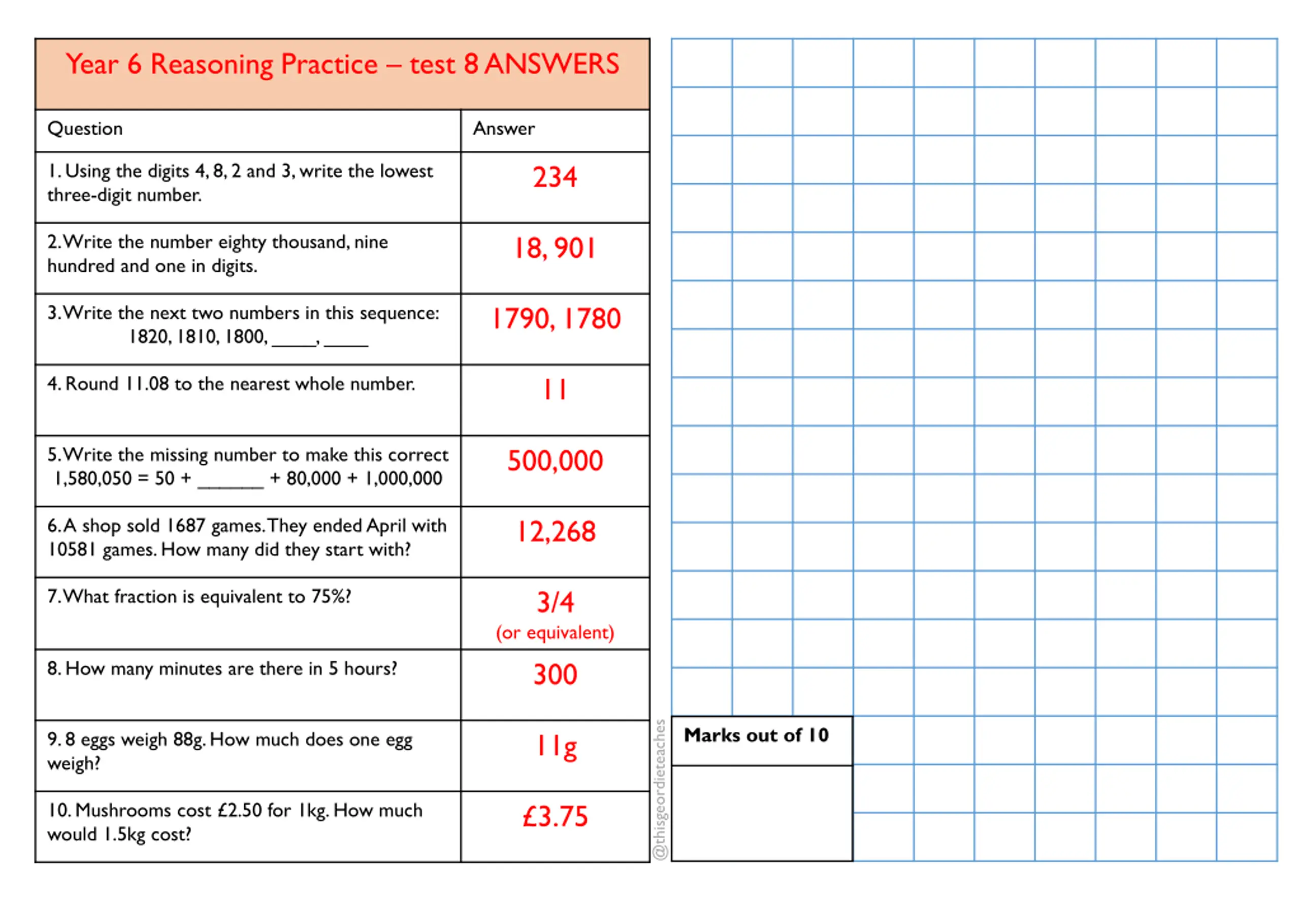 Year 6 Reasoning Practice – test 8 Question Answer 1. Using the digits 4, 6, 2 and 3, write the lowest three-digit number. 2. Write the number eighty thousand, nine hundred and one in digits. 3. Write the next two numbers in this sequence: 1820, 1810, 1800, ____, ____ 4. Round 11.08 to the nearest whole number. 5. Write the missing number to make this correct 1,580,050 = 50 + ______ + 80,000 + 1,000,000 6. A shop sold 1687 games. They ended April with 10581 games. How many did they start with? 7. What fraction is equivalent to 75%? 8. How many minutes are there in 5 hours? @thisgeordieteaches Marks out of 10 9. 8 eggs weigh 88g. How much does one egg weigh? 10. Mushrooms cost £2.50 for 1kg. How much would 1.5kg cost?