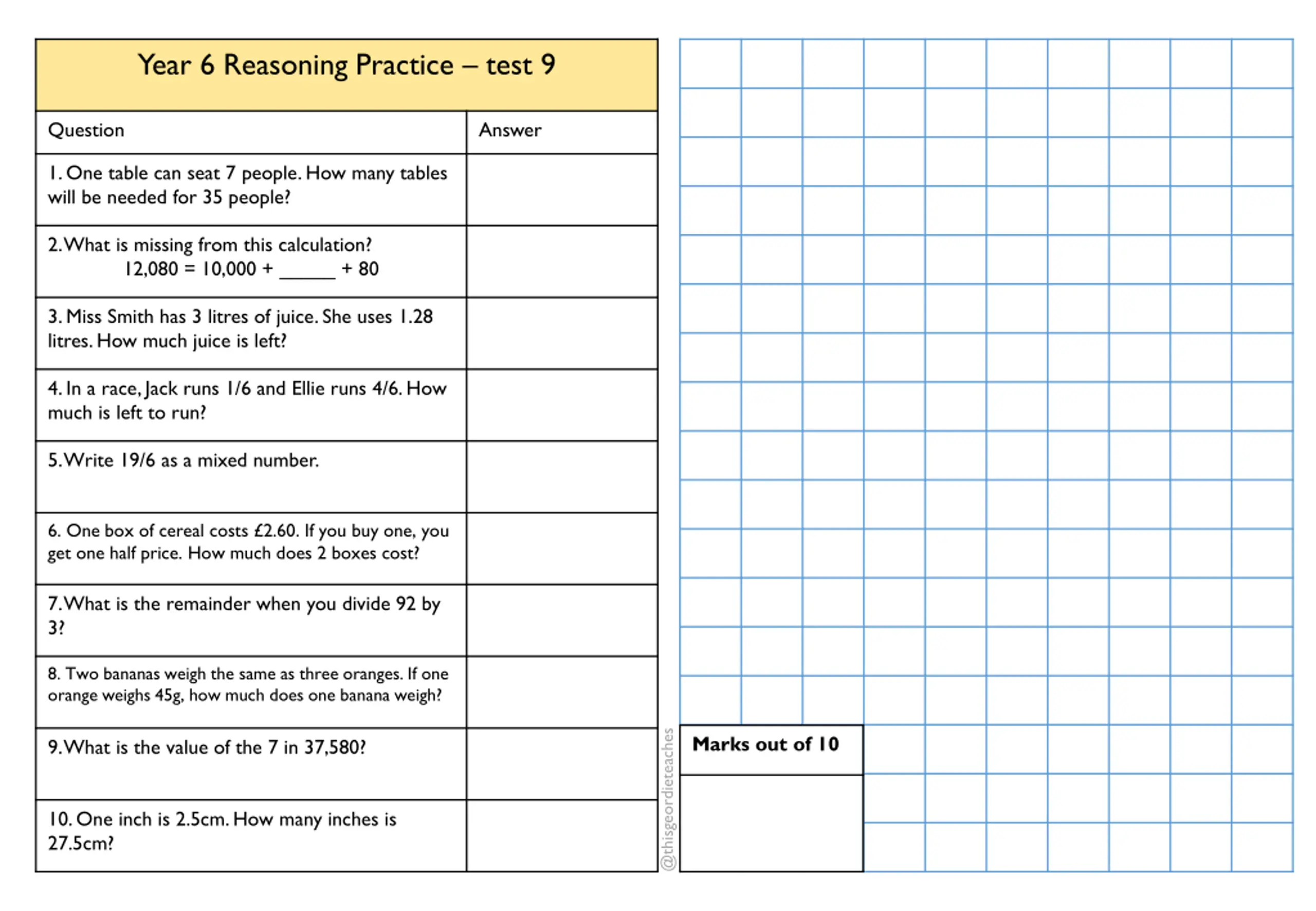 Year 6 Reasoning Practice – test 9 ANSWERS Question Answer 1. One table can seat 7 people. How many tables will be needed for 35 people? 5 2. What is missing from this calculation? 12,080 = 10,000 + _____ + 80 2,000 3. Miss Elliott has 3 litres of juice. She uses 1.28 litres. How much juice is left? 1.72 litres 4. In a race, Jack runs 1/6 and Ellie runs 4/6. How much is left to run? 1/6 5. Write 19/6 as a mixed number. 3 1/6 6. One box of cereal costs £2.60. If you buy one, you get one half price. How much does 2 boxes cost? £3.90 7. What is the remainder when you divide 92 by 3? 2 8. Two bananas weigh the same as three oranges. If one orange weighs 45g, how much does one banana weigh? 67.5g @thisgeordieteaches Marks out of 10 9. What is the value of the 7 in 37,580? 7,000 10. One inch is 2.5cm. How many inches is 27.5cm? 11