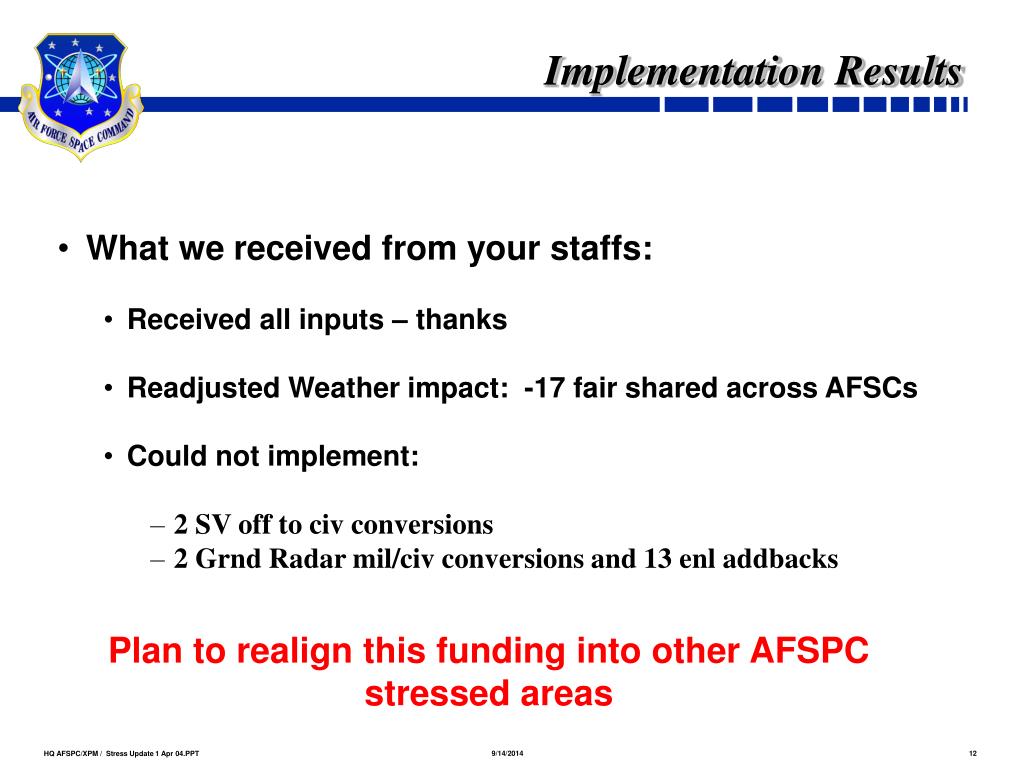 Implementation Results • What we received from your staffs: • Received all inputs – thanks • Readjusted Weather impact: -17 fair shared across AFSCs • Could not implement: • 2 SV off to civ conversions • 2 Grnd Radar mil/civ conversions and 13 enl addbacks Plan to realign this funding into other AFSPC stressed areas