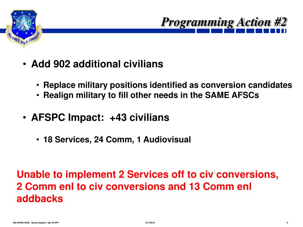 Programming Action #2 • Add 902 additional civilians • Replace military positions identified as conversion candidates • Realign military to fill other needs in the SAME AFSCs • AFSPC Impact: +43 civilians • 18 Services, 24 Comm, 1 Audiovisual • Unable to implement 2 Services off to civ conversions, 2 Comm enl to civ conversions and 13 Comm enl addbacks