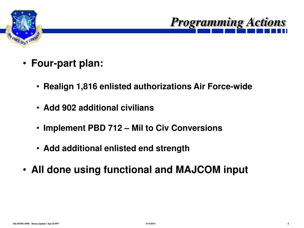 Programming Actions • Four-part plan: • Realign 1,816 enlisted authorizations Air Force-wide • Add 902 additional civilians • Implement PBD 712 – Mil to Civ Conversions • Add additional enlisted end strength • All done using functional and MAJCOM input