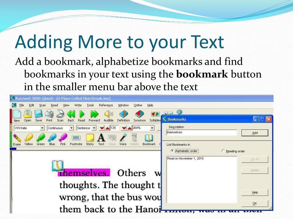 Adding More to your Text Add a bookmark, alphabetize bookmarks and find bookmarks in your text using the bookmark button in the smaller menu bar above the text