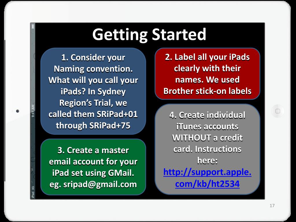 Getting Started 1. Consider your Naming convention. What will you call your iPads? In Sydney Region’s Trial, we called them SRiPad+01 through SRiPad+75 2. Label all your iPads clearly with their names. We used Brother stick-on labels 4. Create individual iTunes accounts WITHOUT a credit card. Instructions here: http://support.apple.com/kb/ht2534 3. Create a master email account for your iPad set using GMail. eg. sripad@gmail.com