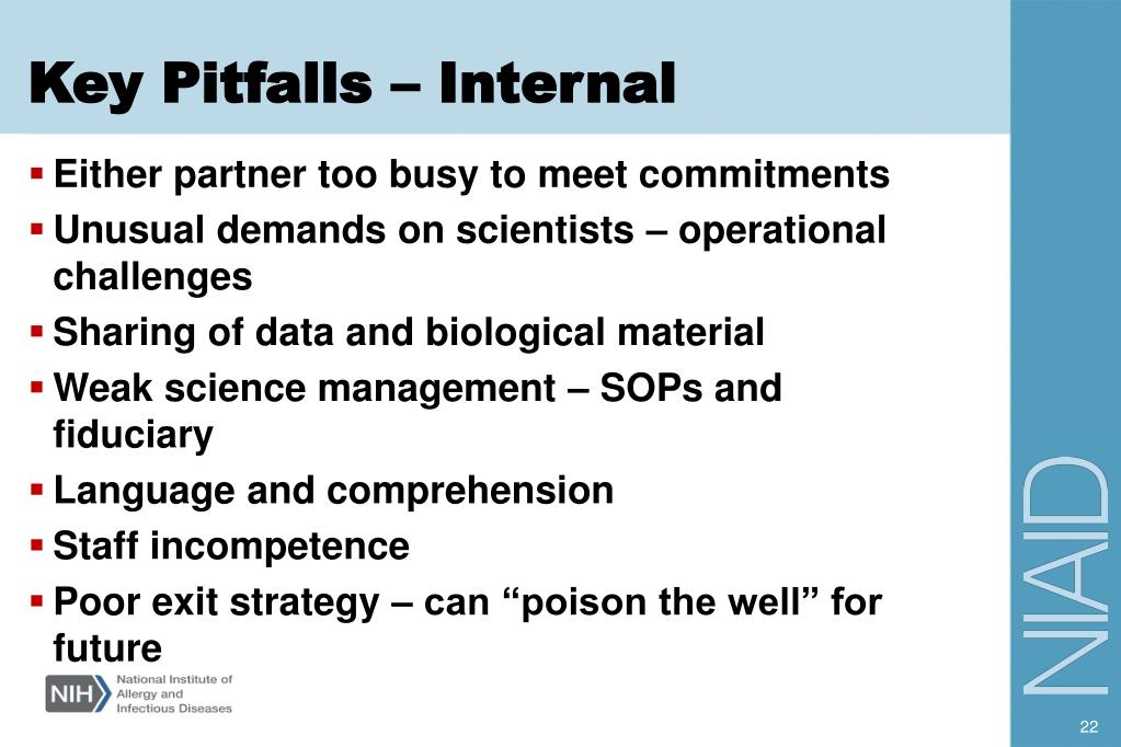 Key Pitfalls – Internal • Either partner too busy to meet commitments • Unusual demands on scientists – operational challenges • Sharing of data and biological material • Weak science management – SOPs and fiduciary • Language and comprehension • Staff incompetence • Poor exit strategy – can “poison the well” for future
