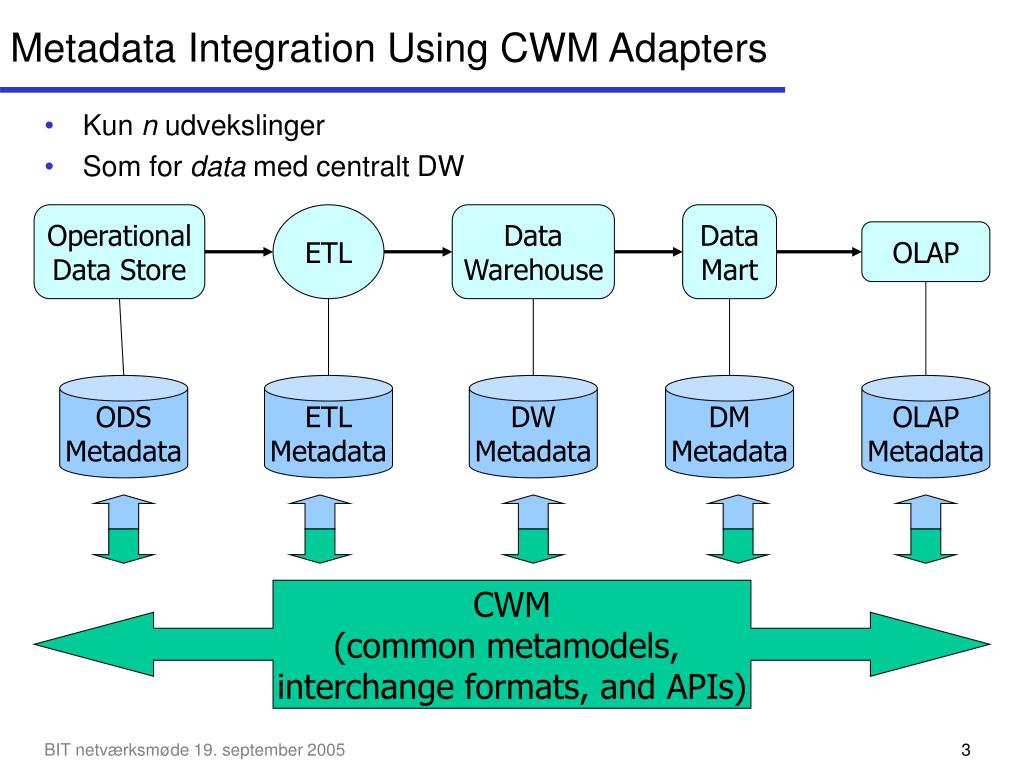 Metadata Integration Using CWM Adapters • Kun n udvekslinger • Som for data med centralt DW Operational Data Store ETL Data Warehouse Data Mart OLAP ODS Metadata ETL Metadata DW Metadata DM Metadata OLAP Metadata CWM (common metamodels, interchange formats, and APIs) BIT netværksmøde 19. september 2005