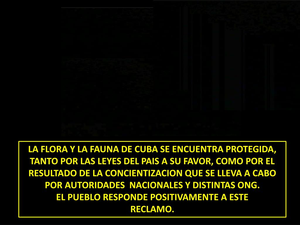 LA FLORA Y LA FAUNA DE CUBA SE ENCUENTRA PROTEGIDA, TANTO POR LAS LEYES DEL PAIS A SU FAVOR, COMO POR EL RESULTADO DE LA CONCIENTIZACION QUE SE LLEVA A CABO POR AUTORIDADES NACIONALES Y DISTINTAS ONG. EL PUEBLO RESPONDE POSITIVAMENTE A ESTE RECLAMO.
