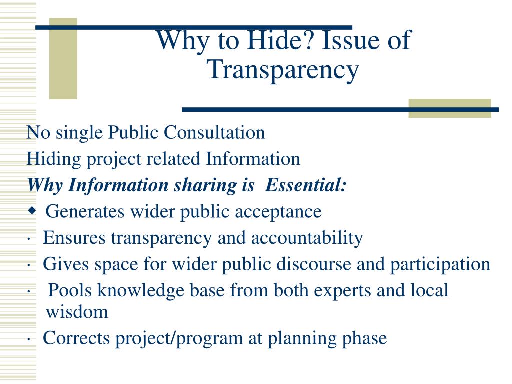 Why to Hide? Issue of Transparency No single Public Consultation Hiding project related Information Why Information sharing is Essential: • Generates wider public acceptance ·Ensures transparency and accountability ·Gives space for wider public discourse and participation ·Pools knowledge base from both experts and local wisdom ·Corrects project/program at planning phase