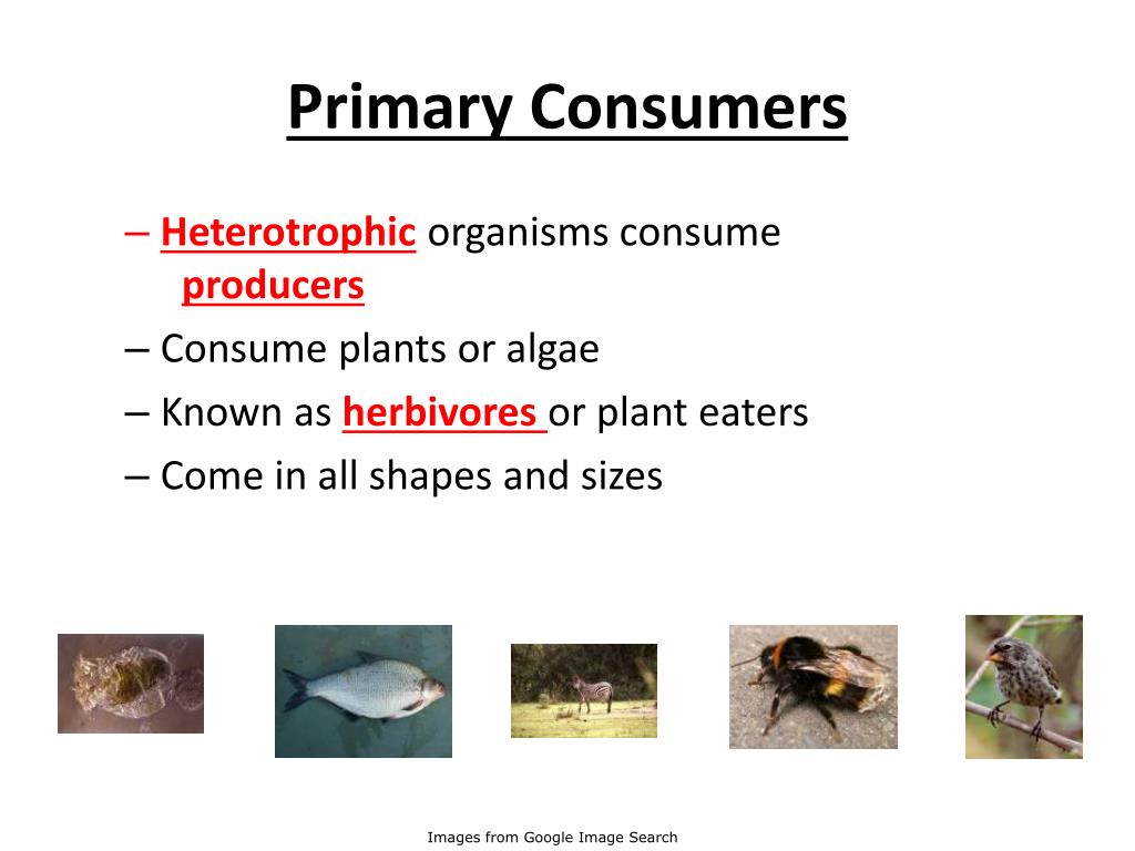 Primary Consumers • Heterotrophic organisms consume producers • Consume plants or algae • Known as herbivores or plant eaters • Come in all shapes and sizes Images from Google Image Search