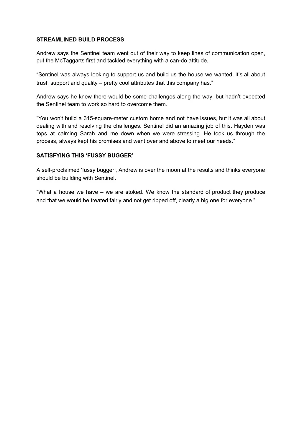 STREAMLINED BUILD PROCESS Andrew says the Sentinel team went out of their way to keep lines of communication open, put the McTaggarts first and tackled everything with a can-do attitude. “Sentinel was always looking to support us and build us the house we wanted. It’s all about trust, support and quality – pretty cool attributes that this company has.” Andrew says he knew there would be some challenges along the way, but hadn’t expected the Sentinel team to work so hard to overcome them. “You won't build a 315-square-meter custom home and not have issues, but it was all about dealing with and resolving the challenges. Sentinel did an amazing job of this. Hayden was tops at calming Sarah and me down when we were stressing. He took us through the process, always kept his promises and went over and above to meet our needs.” SATISFYING THIS ‘FUSSY BUGGER’ A self-proclaimed ‘fussy bugger’, Andrew is over the moon at the results and thinks everyone should be building with Sentinel. “What a house we have – we are stoked. We know the standard of product they produce and that we would be treated fairly and not get ripped off, clearly a big one for everyone.”