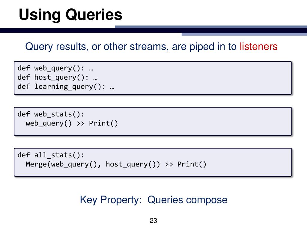 Using Queries Query results, or other streams, are piped in to listeners defweb_query():… defhost_query(): … deflearning_query(): … defweb_stats(): web_query() >> Print() defall_stats(): Merge(web_query(), host_query()) >> Print() Key Property: Queries compose