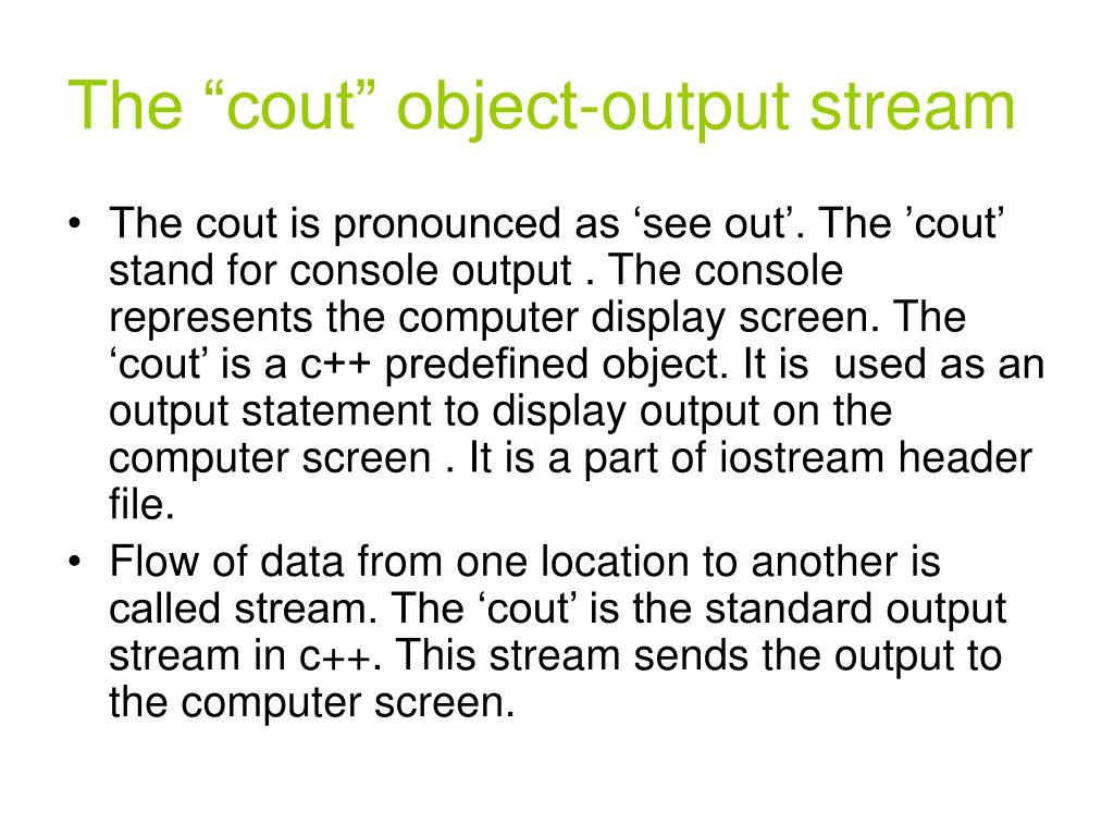 The “cout” object-output stream • The cout is pronounced as ‘see out’. The ’cout’ stand for console output . The console represents the computer display screen. The ‘cout’ is a c++ predefined object. It is used as an output statement to display output on the computer screen . It is a part of iostream header file. • Flow of data from one location to another is called stream. The ‘cout’ is the standard output stream in c++. This stream sends the output to the computer screen.