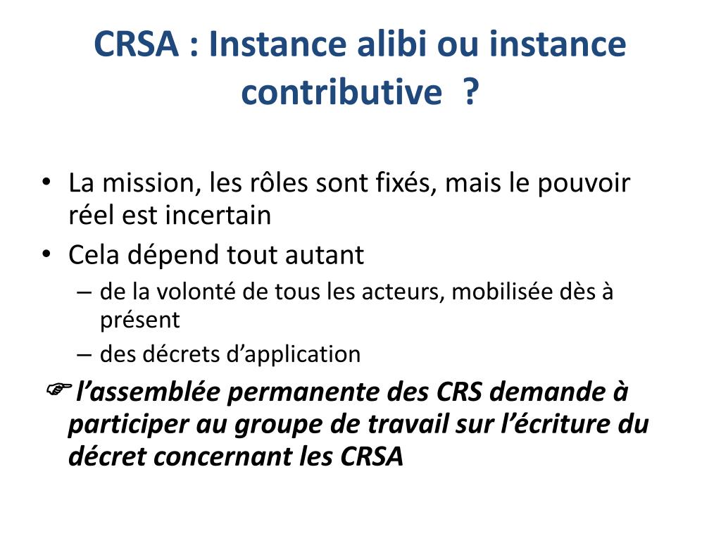 CRSA : Instance alibi ou instance contributive ? • La mission, les rôles sont fixés, mais le pouvoir réel est incertain • Cela dépend tout autant • de la volonté de tous les acteurs, mobilisée dès à présent • des décrets d’application l’assemblée permanente des CRS demande à participer au groupe de travail sur l’écriture du décret concernant les CRSA