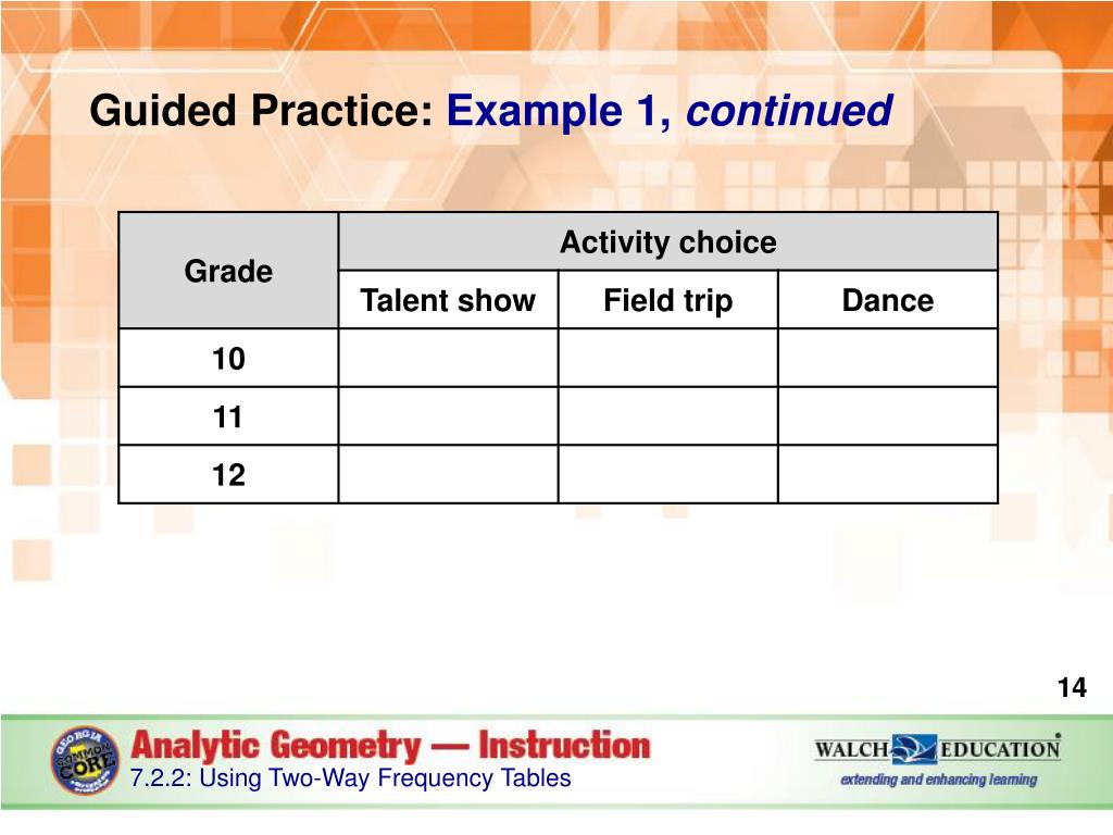 Guided Practice: Example 1, continued Key: TS = Talent show, FT = Field trip, D = Dance 7.2.2: Using Two-Way Frequency Tables