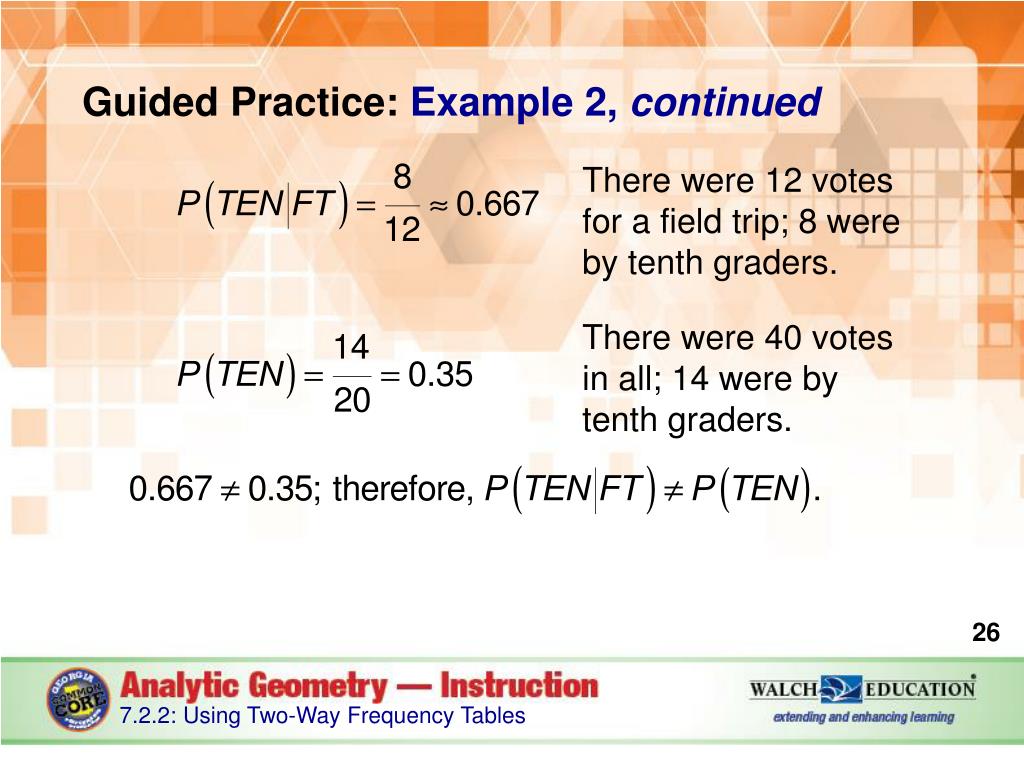 Guided Practice: Example 2, continued Determine if TEN and FT are independent. Remember that events A and B are independent events if or if Compare with P(TEN) and with P(FT). 7.2.2: Using Two-Way Frequency Tables