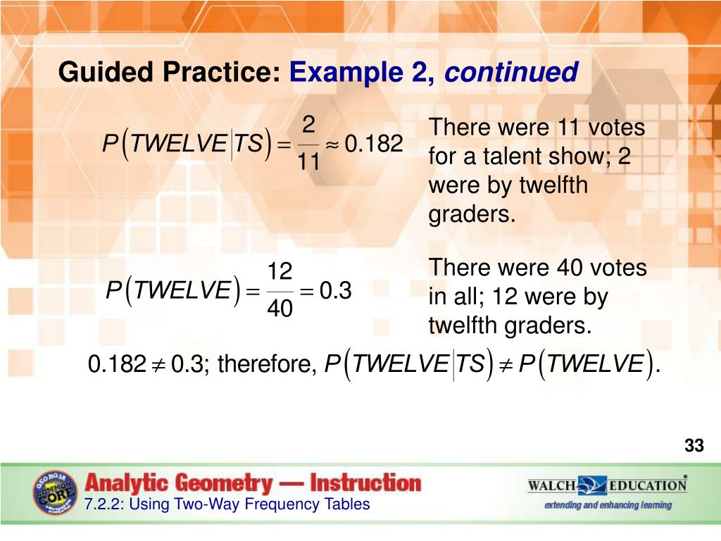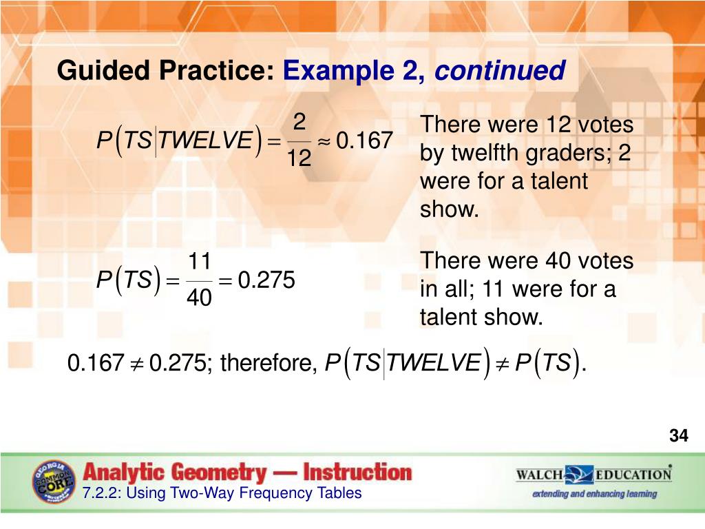 Guided Practice: Example 2, continued Based on the data, TWELVE and TS are dependent because 7.2.2: Using Two-Way Frequency Tables