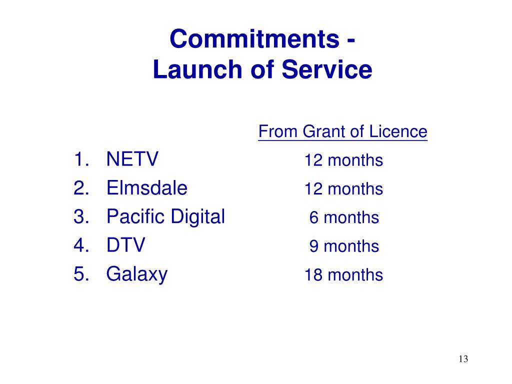 Commitments - Launch of Service From Grant of Licence 1. NETV 12 months 2. Elmsdale 12 months 3. Pacific Digital 6 months 4. DTV 9 months 5. Galaxy 18 months