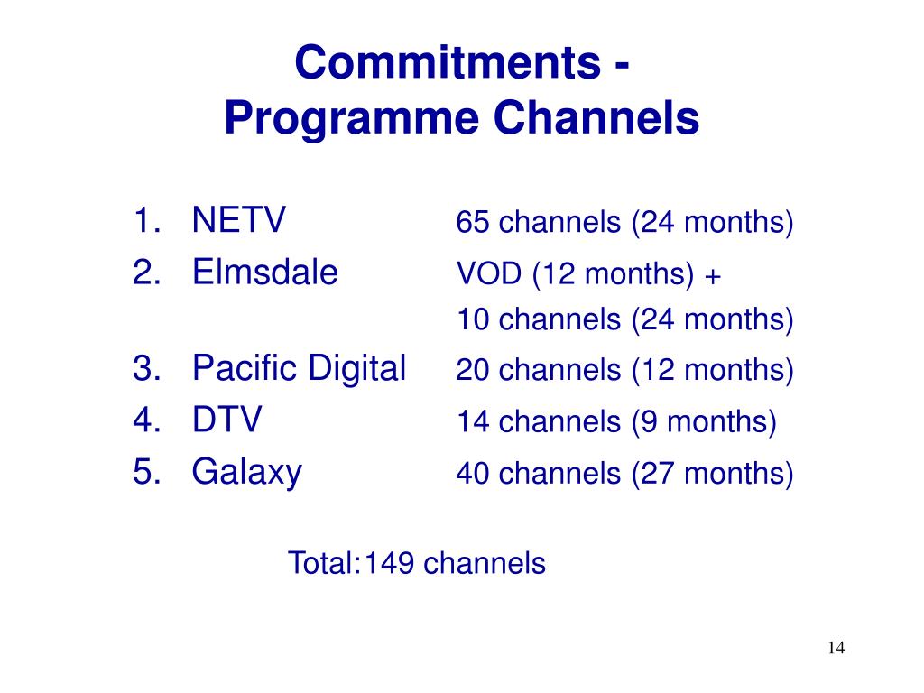Commitments - Programme Channels 1. NETV 65 channels (24 months) 2. Elmsdale VOD (12 months) + 10 channels (24 months) 3. Pacific Digital 20 channels (12 months) 4. DTV 14 channels (9 months) 5. Galaxy 40 channels (27 months) Total: 149 channels