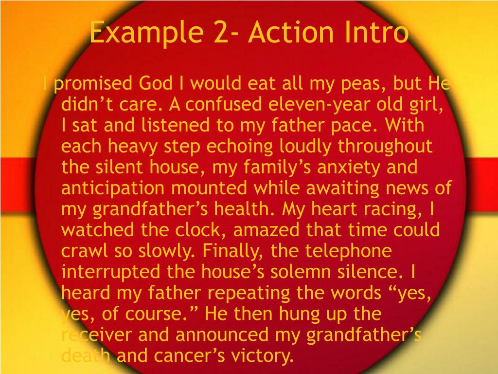 Example 2- Action Intro I promised God I would eat all my peas, but He didn’t care. A confused eleven-year old girl, I sat and listened to my father pace. With each heavy step echoing loudly throughout the silent house, my family’s anxiety and anticipation mounted while awaiting news of my grandfather’s health. My heart racing, I watched the clock, amazed that time could crawl so slowly. Finally, the telephone interrupted the house’s solemn silence. I heard my father repeating the words “yes, yes, of course.” He then hung up the receiver and announced my grandfather’s death and cancer’s victory.