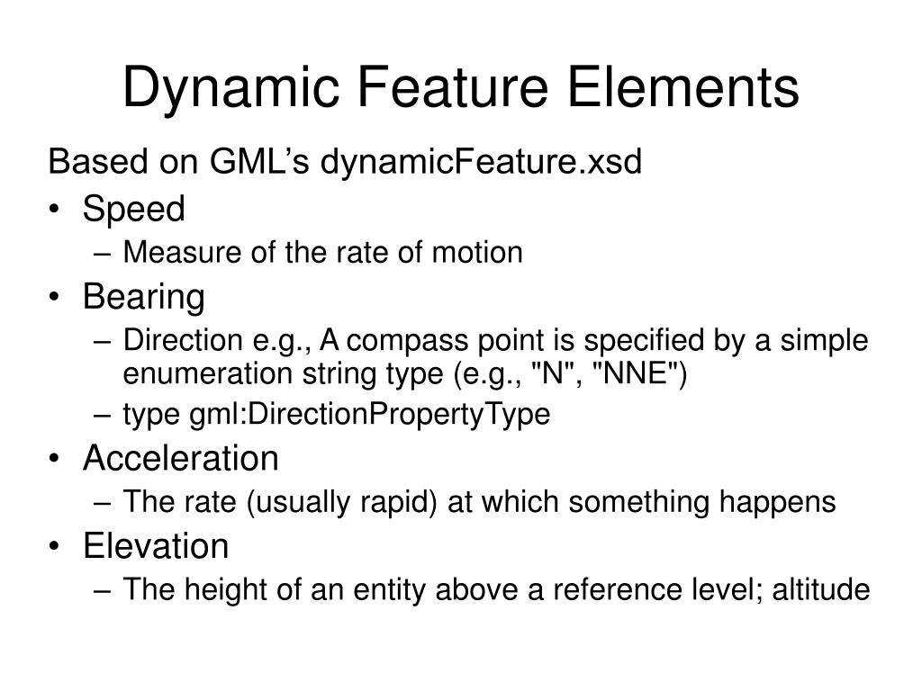 Dynamic Feature Elements Based on GML’s dynamicFeature.xsd • Speed • Measure of the rate of motion • Bearing • Direction e.g., A compass point is specified by a simple enumeration string type (e.g., "N", "NNE") • type gml:DirectionPropertyType • Acceleration • The rate (usually rapid) at which something happens • Elevation • The height of an entity above a reference level; altitude