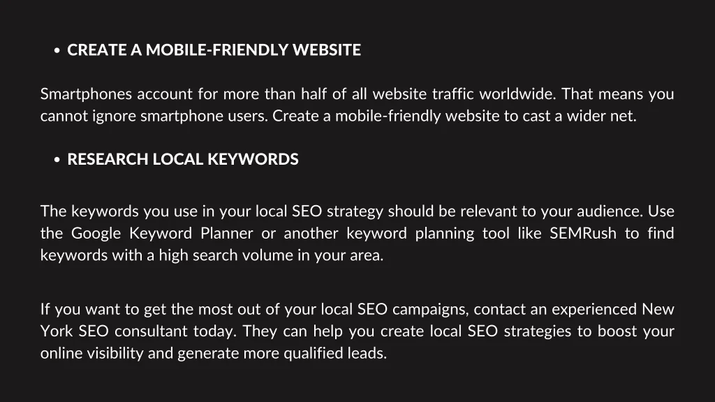 CREATE A MOBILE-FRIENDLY WEBSITE Smartphones account for more than half of all website traffic worldwide. That means you cannot ignore smartphone users. Create a mobile-friendly website to cast a wider net. RESEARCH LOCAL KEYWORDS The keywords you use in your local SEO strategy should be relevant to your audience. Use the Google Keyword Planner or another keyword planning tool like SEMRush to find keywords with a high search volume in your area. If you want to get the most out of your local SEO campaigns, contact an experienced New York SEO consultant today. They can help you create local SEO strategies to boost your online visibility and generate more qualified leads.