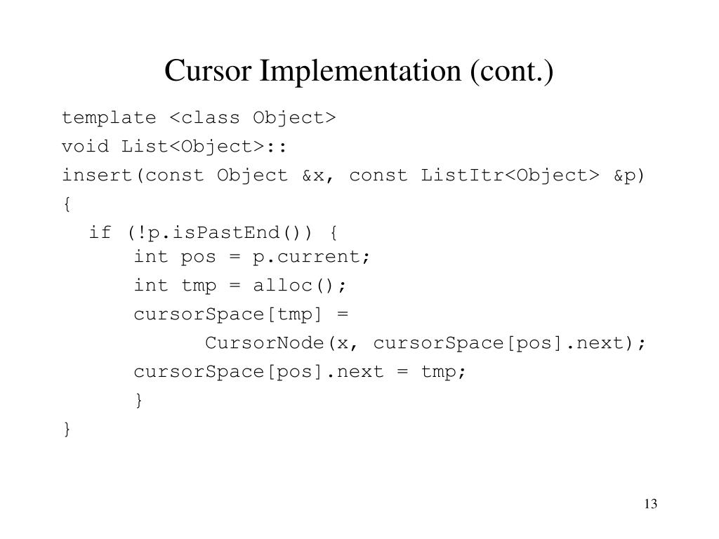 Cursor Implementation (cont.) • template <class Object> • void List<Object>:: • insert(const Object &x, const ListItr<Object> &p) • { • if (!p.isPastEnd()) { int pos = p.current; • int tmp = alloc(); • cursorSpace[tmp] = • CursorNode(x, cursorSpace[pos].next); • cursorSpace[pos].next = tmp; • } • }