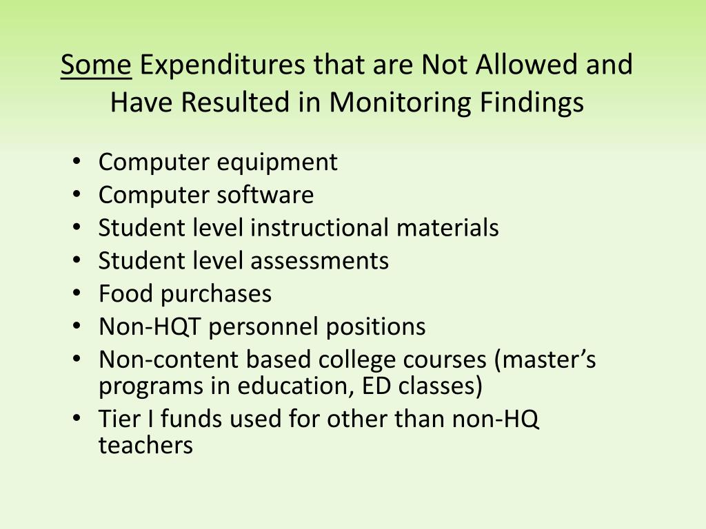 Some Expenditures that are Not Allowed and Have Resulted in Monitoring Findings • Computer equipment • Computer software • Student level instructional materials • Student level assessments • Food purchases • Non-HQT personnel positions • Non-content based college courses (master’s programs in education, ED classes) • Tier I funds used for other than non-HQ teachers