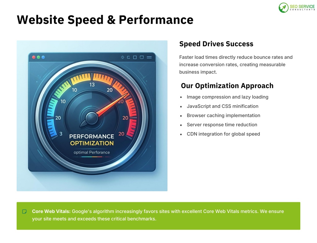 5. Website Speed & Performance Speed Drives Success Faster load times directly reduce bounce rates and increase conversion rates, creating measurable business impact. Our Optimization Approach Image compression and lazy loading JavaScript and CSS minification Browser caching implementation Server response time reduction CDN integration for global speed Core Web Vitals: Google's algorithm increasingly favors sites with excellent Core Web Vitals metrics. We ensure your site meets and exceeds these critical benchmarks.
