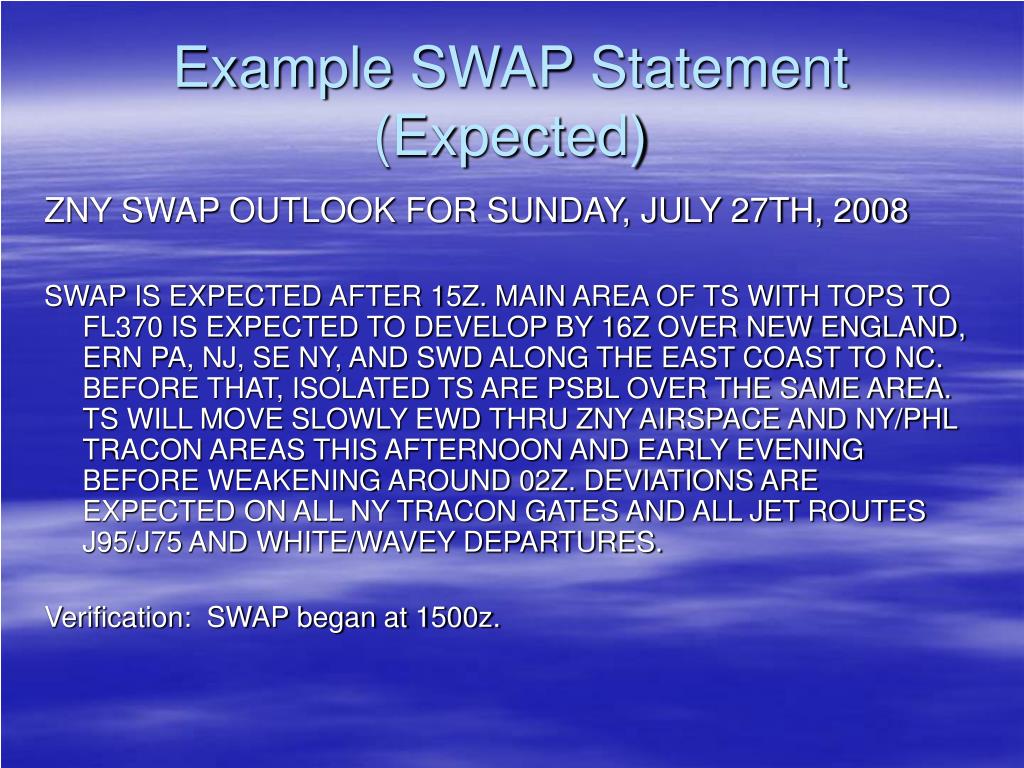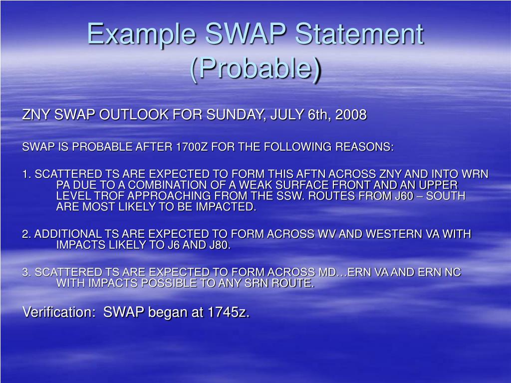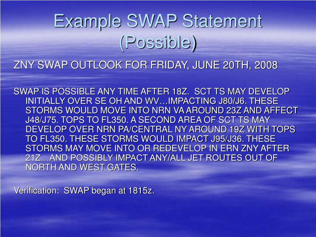 Example SWAP Statement(Probable) ZNY SWAP OUTLOOK FOR SUNDAY, JULY 6th, 2008 SWAP IS PROBABLE AFTER 1700Z FOR THE FOLLOWING REASONS: 1. SCATTERED TS ARE EXPECTED TO FORM THIS AFTN ACROSS ZNY AND INTO WRN PA DUE TO A COMBINATION OF A WEAK SURFACE FRONT AND AN UPPER LEVEL TROF APPROACHING FROM THE SSW. ROUTES FROM J60 – SOUTH ARE MOST LIKELY TO BE IMPACTED. 2. ADDITIONAL TS ARE EXPECTED TO FORM ACROSS WV AND WESTERN VA WITH IMPACTS LIKELY TO J6 AND J80. 3. SCATTERED TS ARE EXPECTED TO FORM ACROSS MD…ERN VA AND ERN NC WITH IMPACTS POSSIBLE TO ANY SRN ROUTE. Verification: SWAP began at 1745z.