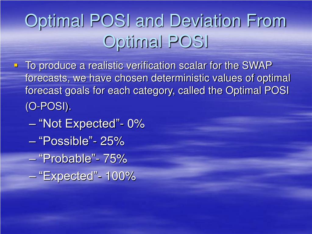 Optimal POSI and Deviation From Optimal POSI • To produce a realistic verification scalar for the SWAP forecasts, we have chosen deterministic values of optimal forecast goals for each category, called the Optimal POSI (O-POSI). • “Not Expected”- 0% • “Possible”- 25% • “Probable”- 75% • “Expected”- 100%