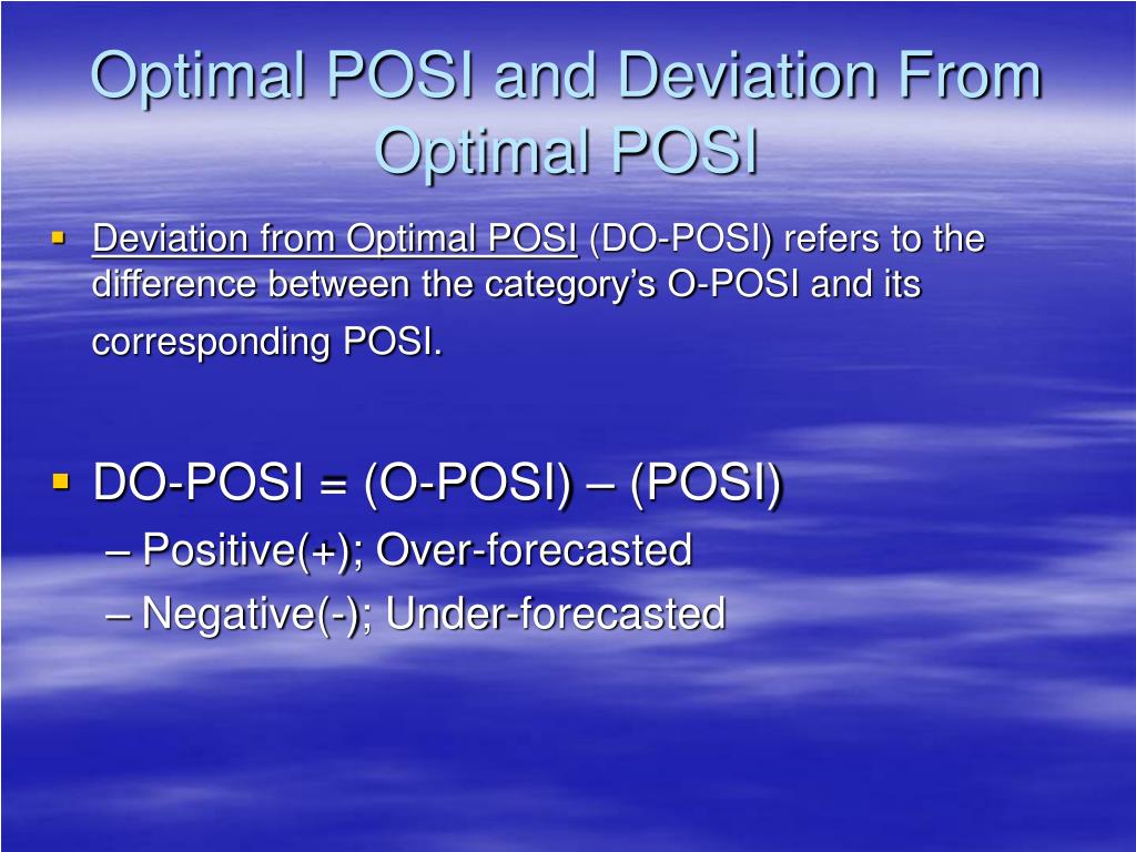 Optimal POSI and Deviation From Optimal POSI • Deviation from Optimal POSI (DO-POSI) refers to the difference between the category’s O-POSI and its corresponding POSI. • DO-POSI = (O-POSI) – (POSI) • Positive(+); Over-forecasted • Negative(-); Under-forecasted