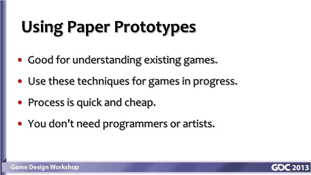 Using Paper Prototypes • Good for understanding existing games. • Use these techniques for games in progress. • Process is quick and cheap. • You don’t need programmers or artists.