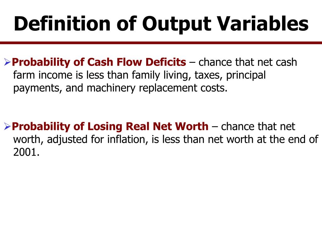 Definition of Output Variables • Probability of Cash Flow Deficits – chance that net cash farm income is less than family living, taxes, principal payments, and machinery replacement costs. • Probability of Losing Real Net Worth – chance that net worth, adjusted for inflation, is less than net worth at the end of 2001.