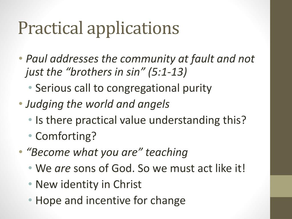 Practical applications • Paul addresses the community at fault and not just the “brothers in sin” (5:1-13) • Serious call to congregational purity • Judging the world and angels • Is there practical value understanding this? • Comforting? • “Become what you are” teaching • We are sons of God. So we must act like it! • New identity in Christ • Hope and incentive for change