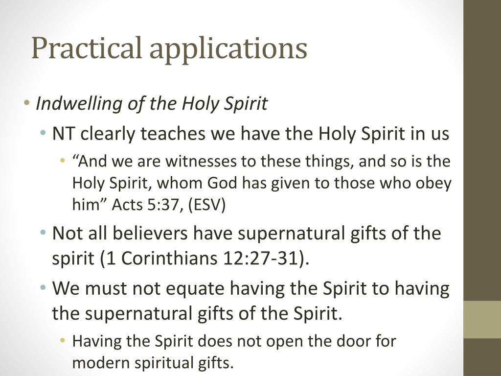 Practical applications • Indwelling of the Holy Spirit • NT clearly teaches we have the Holy Spirit in us • “And we are witnesses to these things, and so is the Holy Spirit, whom God has given to those who obey him” Acts 5:37, (ESV) • Not all believers have supernatural gifts of the spirit (1 Corinthians 12:27-31). • We must not equate having the Spirit to having the supernatural gifts of the Spirit. • Having the Spirit does not open the door for modern spiritual gifts.