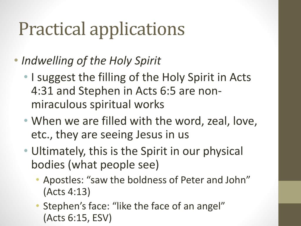 Practical applications • Indwelling of the Holy Spirit • I suggest the filling of the Holy Spirit in Acts 4:31 and Stephen in Acts 6:5 are non-miraculous spiritual works • When we are filled with the word, zeal, love, etc., they are seeing Jesus in us • Ultimately, this is the Spirit in our physical bodies (what people see) • Apostles: “saw the boldness of Peter and John”(Acts 4:13) • Stephen’s face: “like the face of an angel” (Acts 6:15, ESV)