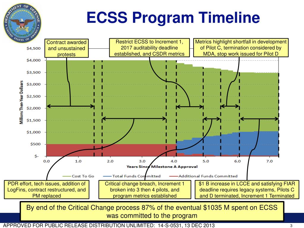 ECSS Program Timeline Restrict ECSS to Increment 1, 2017 auditability deadline established, and CSDR metrics Metrics highlight shortfall in development of Pilot C, termination considered by MDA, stop work issued for Pilot D Contract awarded and unsustained protests PDR effort, tech issues, addition of LogFins, contract restructured, and PM replaced $1 B increase in LCCE and satisfying FIAR deadline requires legacy systems, Pilots C and D terminated, Increment 1 Terminated Critical change breach, Increment 1 broken into 3 then 4 pilots, and program metrics established By end of the Critical Change process 87% of the eventual $1035 M spent on ECSS was committed to the program 3