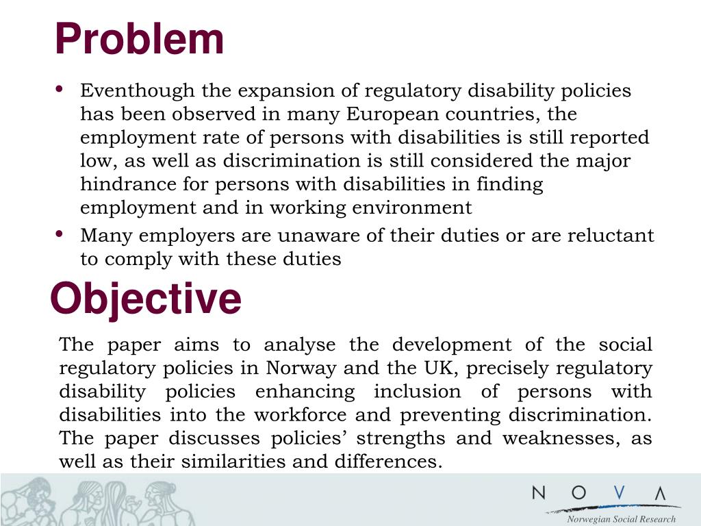 Problem • Eventhough the expansion of regulatory disability policies has been observed in many European countries, the employment rate of persons with disabilities is still reported low, as well as discrimination is still considered the major hindrance for persons with disabilities in finding employment and in working environment • Many employers are unaware of their duties or are reluctant to comply with these duties Objective The paper aims to analyse the development of the social regulatory policies in Norway and the UK, precisely regulatory disability policies enhancing inclusion of persons with disabilities into the workforce and preventing discrimination. The paper discusses policies’ strengths and weaknesses, as well as their similarities and differences.