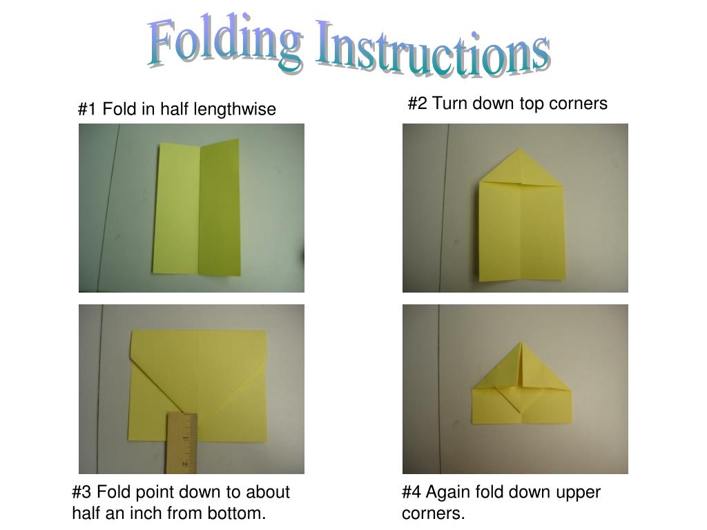 Folding Instructions #2 Turn down top corners #1 Fold in half lengthwise #3 Fold point down to about half an inch from bottom. #4 Again fold down upper corners.
