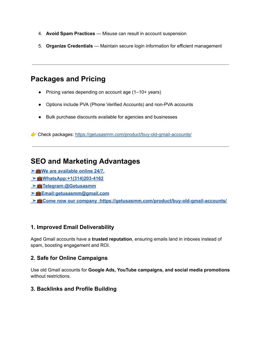 4. Avoid Spam Practices — Misuse can result in account suspension 5. Organize Credentials — Maintain secure login information for efficient management Packages and Pricing ● Pricing varies depending on account age (1–10+ years) ● Options include PVA (Phone Verified Accounts) and non-PVA accounts ● Bulk purchase discounts available for agencies and businesses ? Check packages: https://getusasmm.com/product/buy-old-gmail-accounts/ SEO and Marketing Advantages ➤?We are available online 24/7. ➤?WhatsApp:+1(314)203-4162 ➤?Telegram:@Getusasmm ➤?Email:getusasmm@gmail.com ➤?Come now our company :https://getusasmm.com/product/buy-old-gmail-accounts/ 1. Improved Email Deliverability Aged Gmail accounts have a trusted reputation, ensuring emails land in inboxes instead of spam, boosting engagement and ROI. 2. Safe for Online Campaigns Use old Gmail accounts for Google Ads, YouTube campaigns, and social media promotions without restrictions. 3. Backlinks and Profile Building