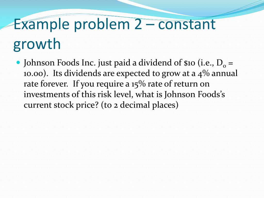 Example problem 2 – constant growth • Johnson Foods Inc. just paid a dividend of $10 (i.e., D0 = 10.00). Its dividends are expected to grow at a 4% annual rate forever. If you require a 15% rate of return on investments of this risk level, what is Johnson Foods’s current stock price? (to 2 decimal places)