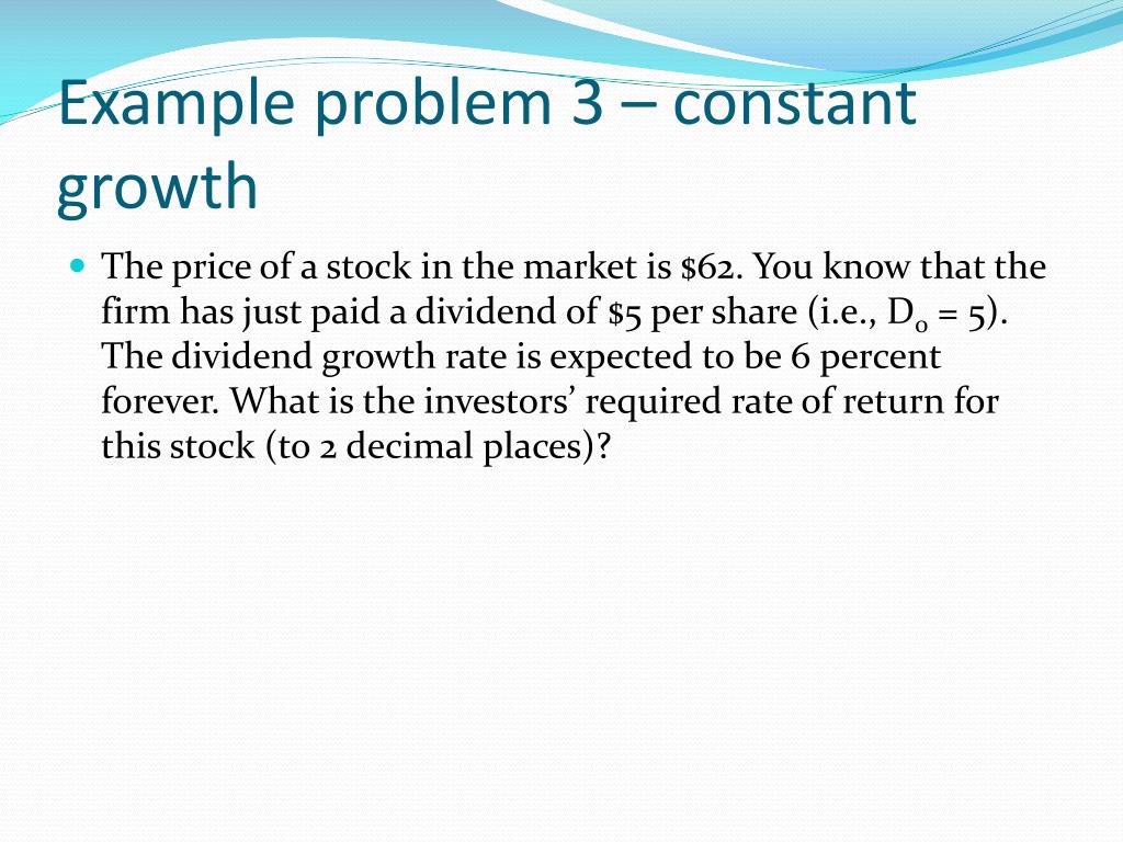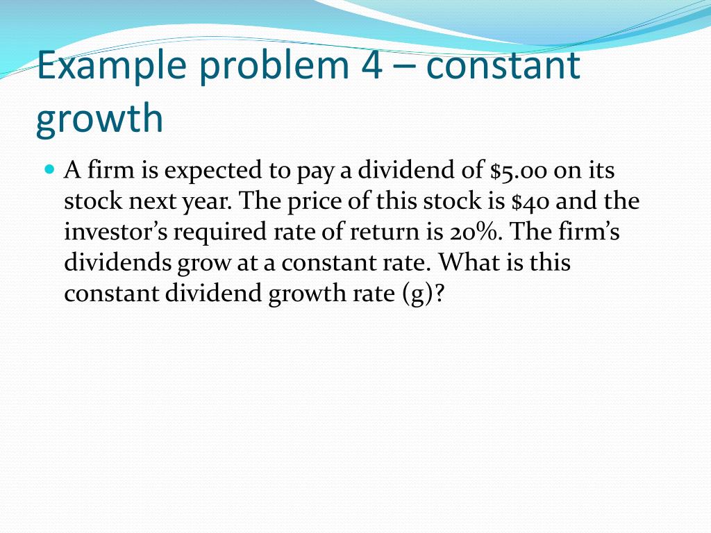 Example problem 4 – constant growth • A firm is expected to pay a dividend of $5.00 on its stock next year. The price of this stock is $40 and the investor’s required rate of return is 20%. The firm’s dividends grow at a constant rate. What is this constant dividend growth rate (g)?