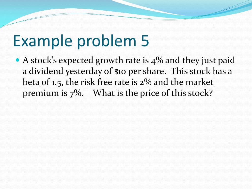 Example problem 5 • A stock’s expected growth rate is 4% and they just paid a dividend yesterday of $10 per share. This stock has a beta of 1.5, the risk free rate is 2% and the market premium is 7%. What is the price of this stock?