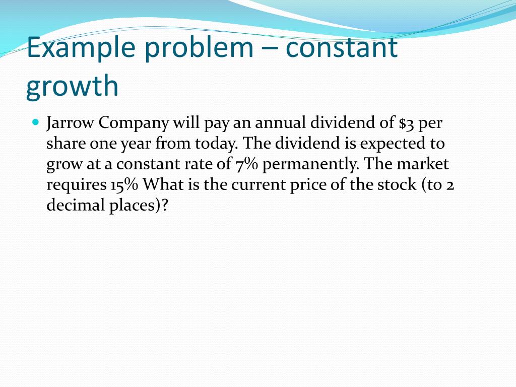 Example problem – constant growth • Jarrow Company will pay an annual dividend of $3 per share one year from today. The dividend is expected to grow at a constant rate of 7% permanently. The market requires 15% What is the current price of the stock (to 2 decimal places)?