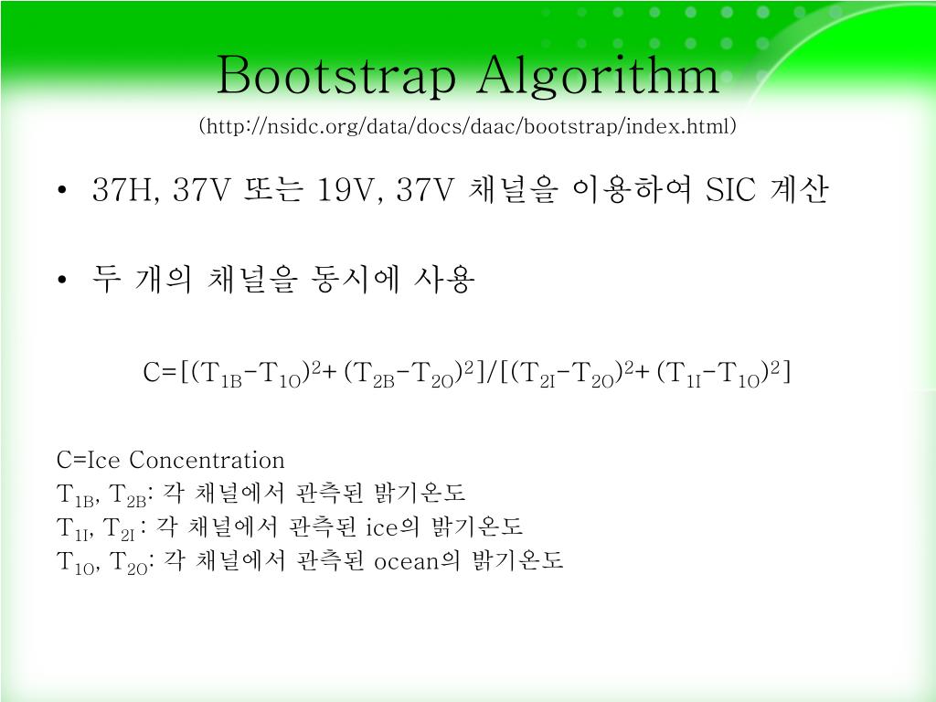 Bootstrap Algorithm (http://nsidc.org/data/docs/daac/bootstrap/index.html) • 37H, 37V 또는 19V, 37V 채널을 이용하여 SIC 계산 • 두 개의 채널을 동시에 사용 C=[(T1B-T1O)2+(T2B-T2O)2]/[(T2I-T2O)2+(T1I-T1O)2] C=Ice Concentration T1B, T2B: 각 채널에서 관측된 밝기온도 T1I, T2I : 각 채널에서 관측된 ice의 밝기온도 T1O, T2O: 각 채널에서 관측된 ocean의 밝기온도