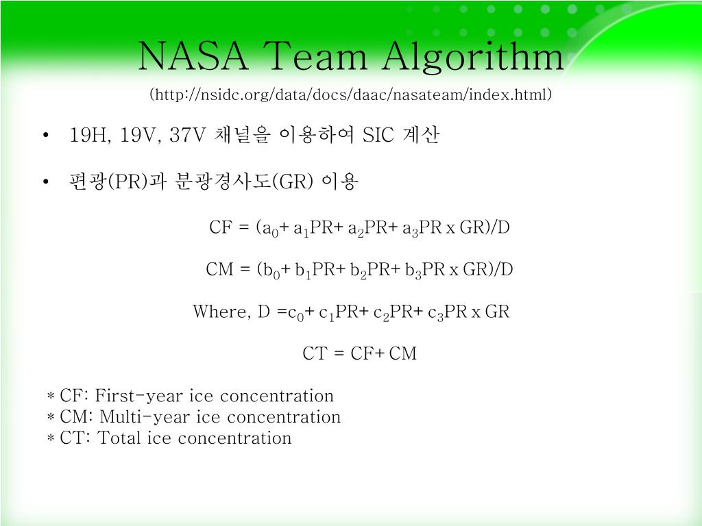 NASA Team Algorithm (http://nsidc.org/data/docs/daac/nasateam/index.html) • 19H, 19V, 37V 채널을 이용하여 SIC 계산 • 편광(PR)과 분광경사도(GR) 이용 CF = (a0+a1PR+a2PR+a3PRⅹGR)/D CM = (b0+b1PR+b2PR+b3PRⅹGR)/D Where, D =c0+c1PR+c2PR+c3PRⅹGR CT = CF+CM *CF: First-year ice concentration *CM: Multi-year ice concentration *CT: Total ice concentration